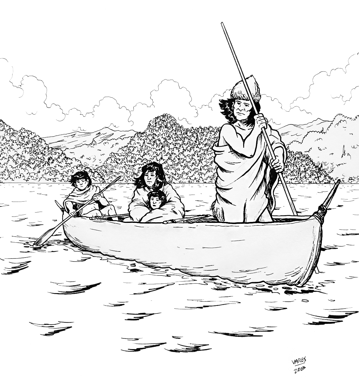 Dibujo que representa la forma de vida de los alacalufes (blanco y negro)