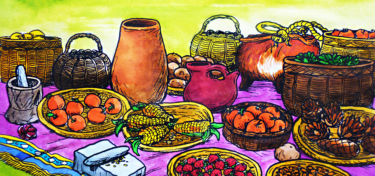 Ilustración que representa a los alimentos americanos que llegaron a Europa (color)