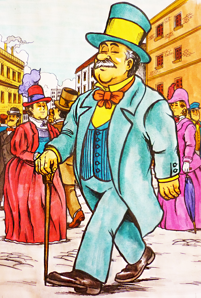 Ilustración que representa a un burgués durante la revolución industrial (color)