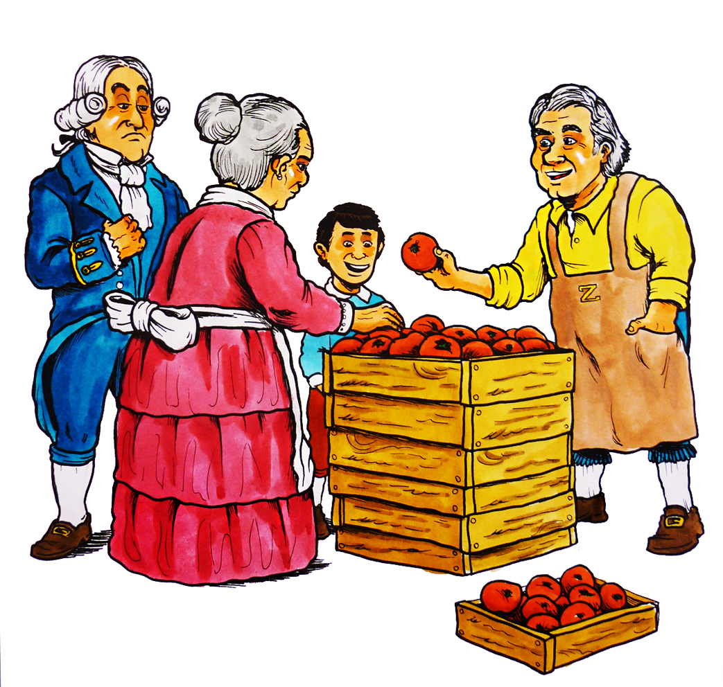 Ilustración que representa al comercio durante la colonia (color)