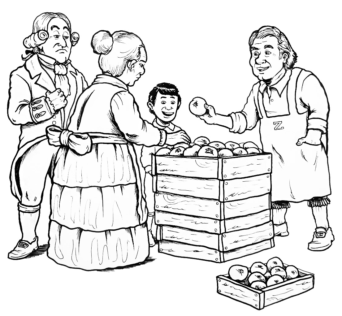 Ilustración que representa al comercio durante la colonia (blanco y negro)