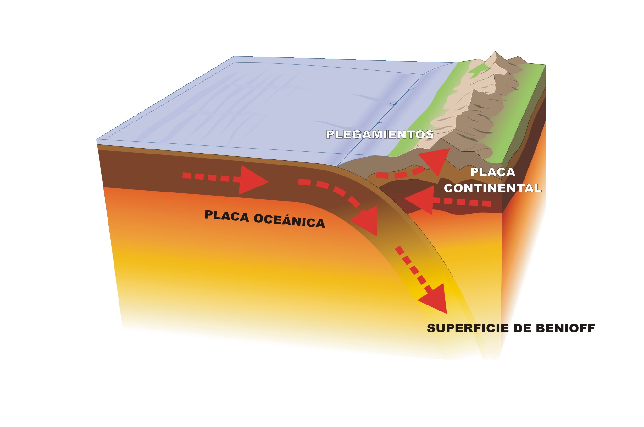 Ilustración que representa el contacto entre una placa oceánica con una continental