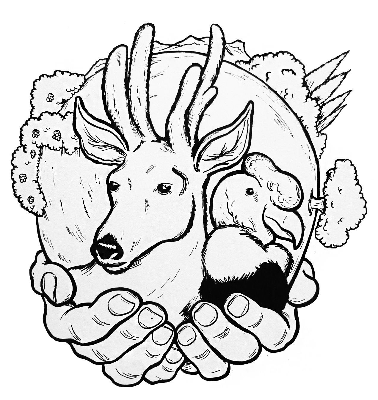 Ilustración que representa el cuidado por el patrimonio natural (blanco y negro)