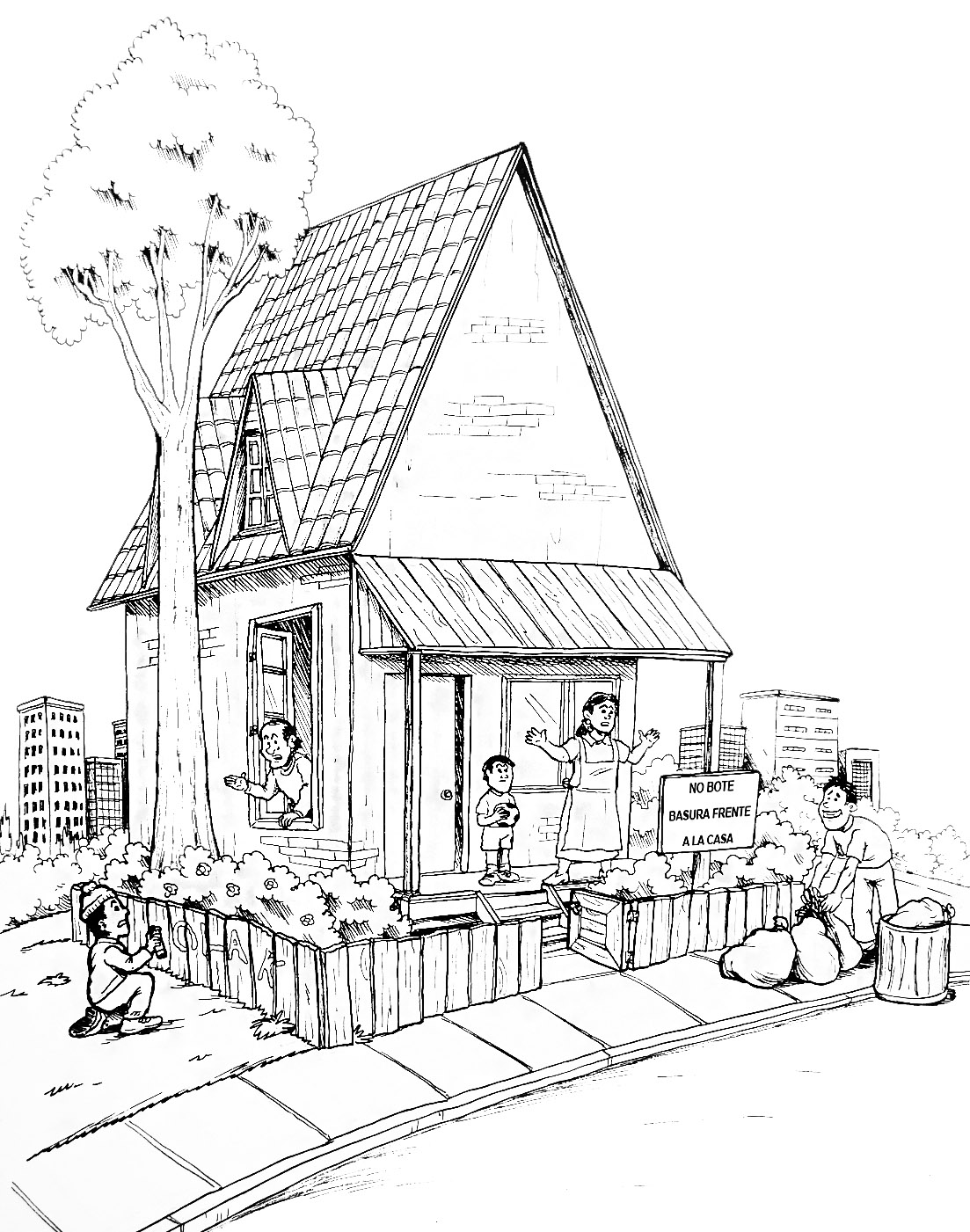 Ilustración que representa lo que no se debe hacer con la propiedad privada (blanco y negro)