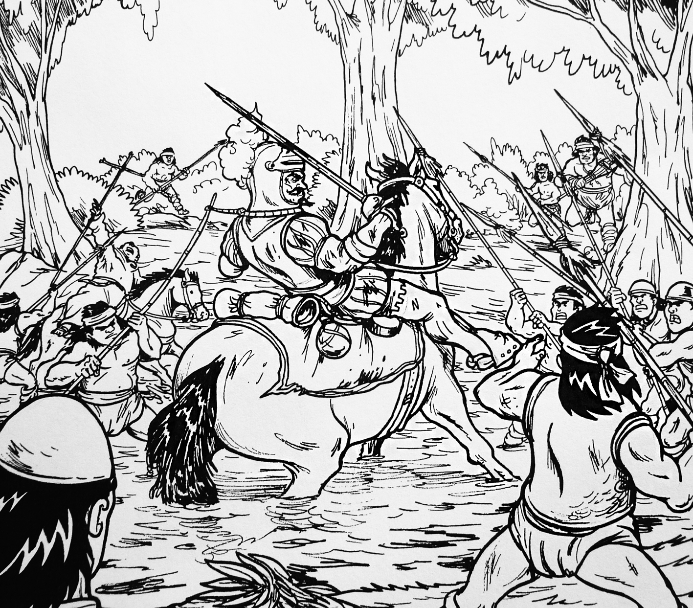 Ilustración que representa el ataque de los mapuches a Pedro de Valdivia (blanco y negro)