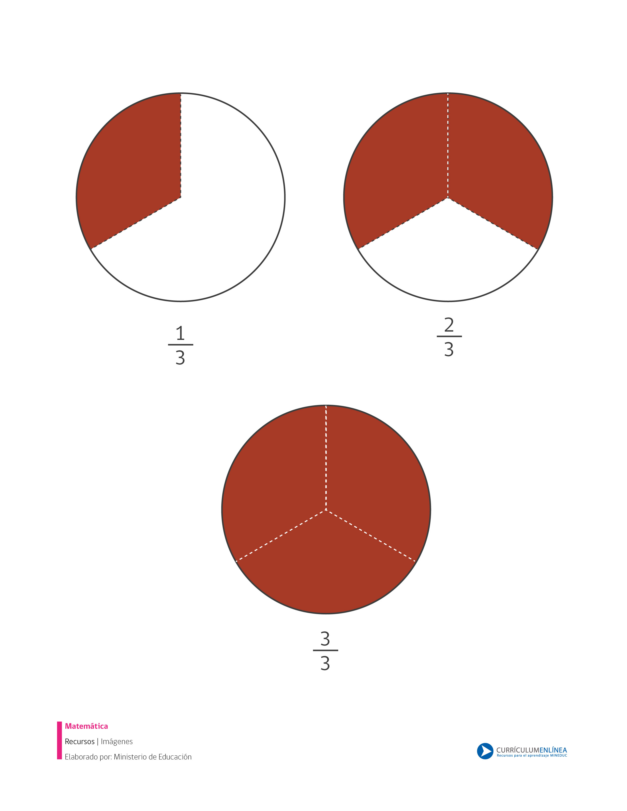 Imagen que muestra fracciones propias con denominador tres que puede ser usada con distintos fines pedagógicos.