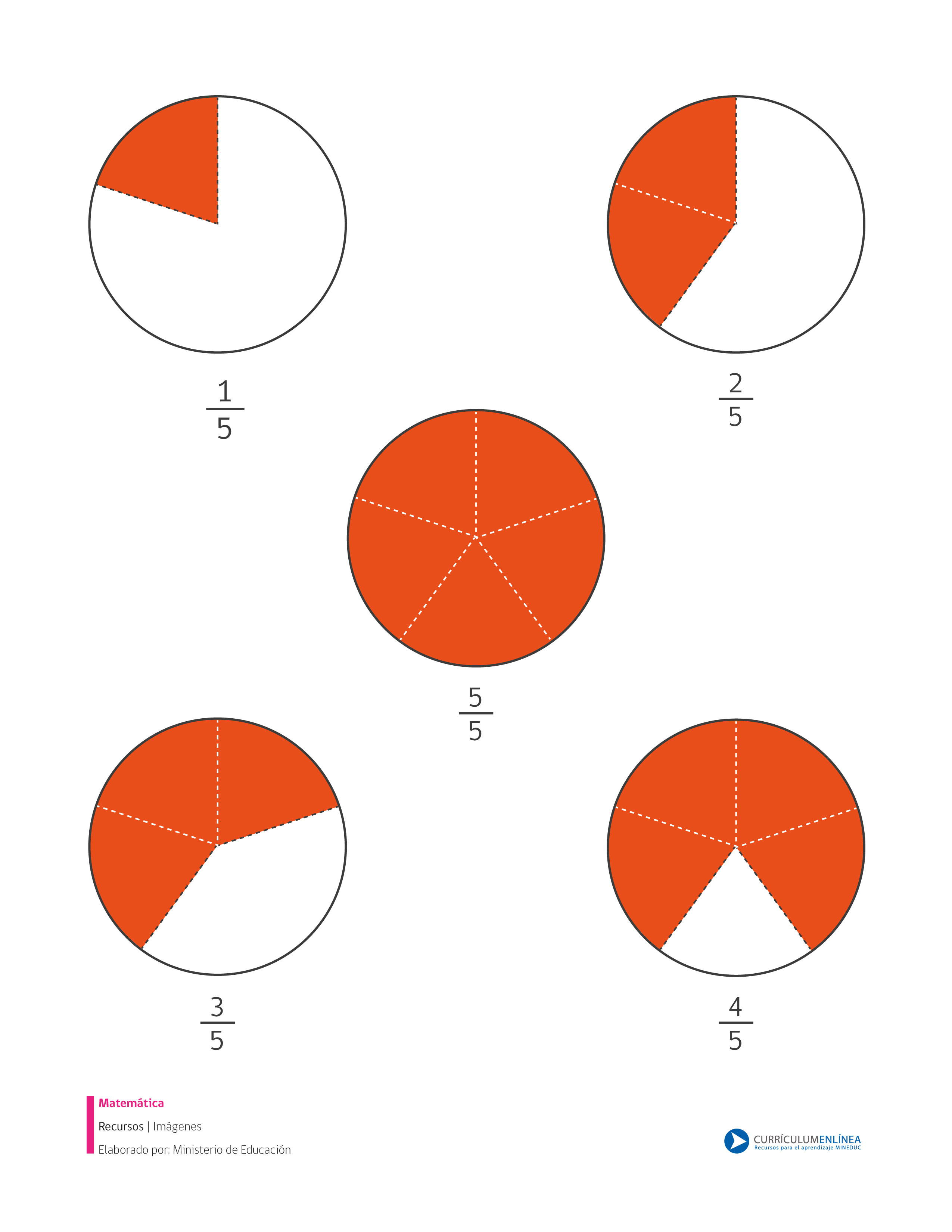 Imagen que muestra fracciones propias con denominador cinco que puede ser usada con distintos fines pedagógicos.