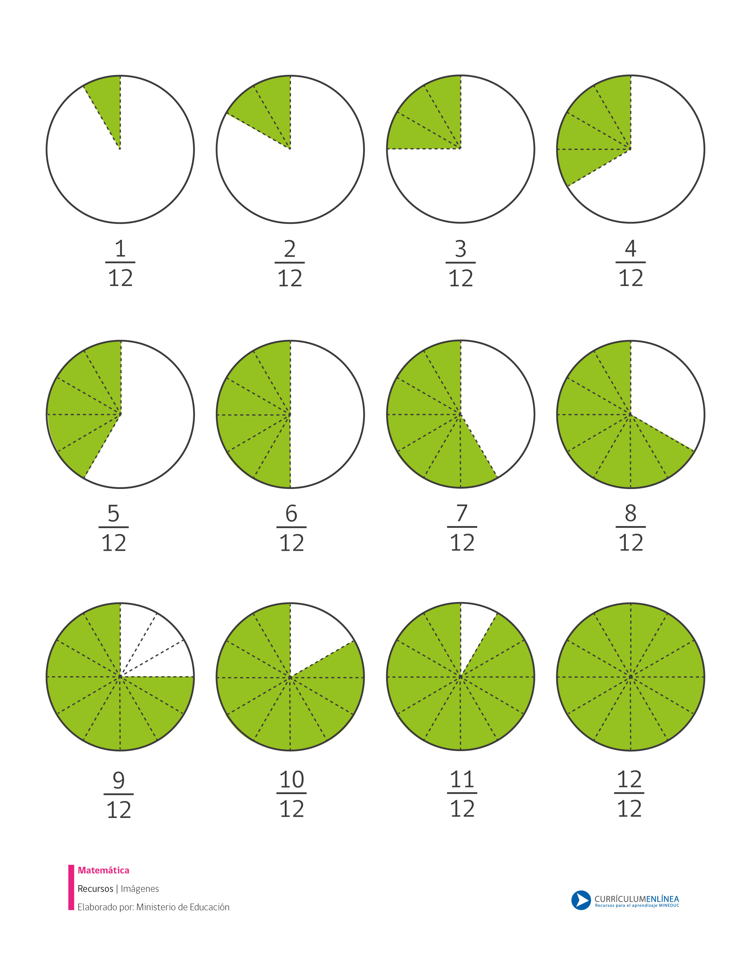 Imagen que muestra fracciones propias con denominador doce que puede ser usada con distintos fines pedagógicos.
