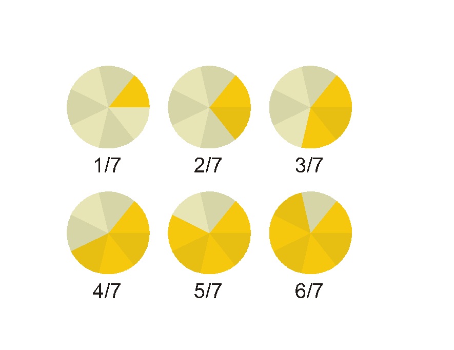 Ejemplo de fracciones con denominador siete en forma pictórica y simbólica