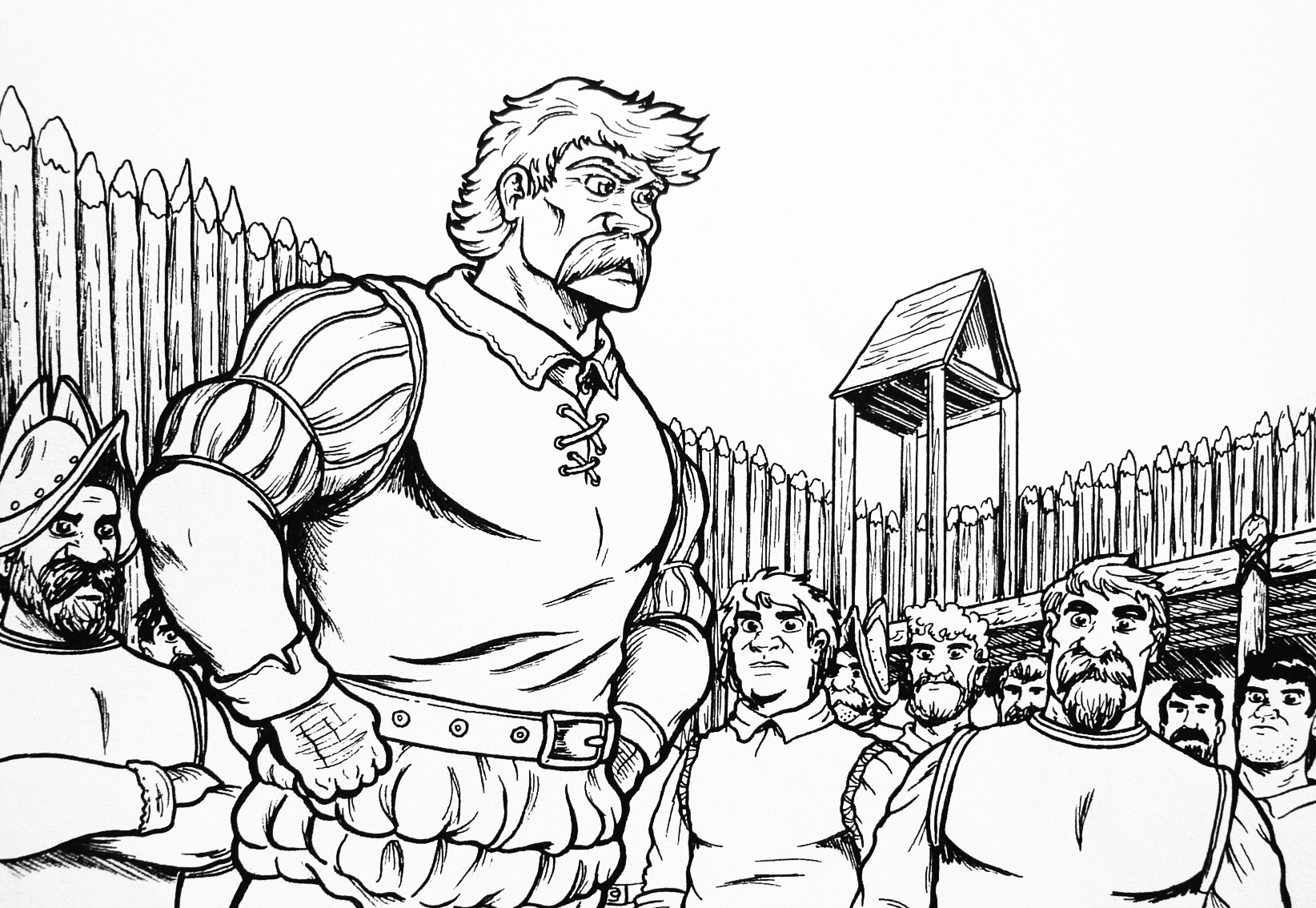 Ilustración que representa un fuerte español durante la conquista de América (blanco y negro)