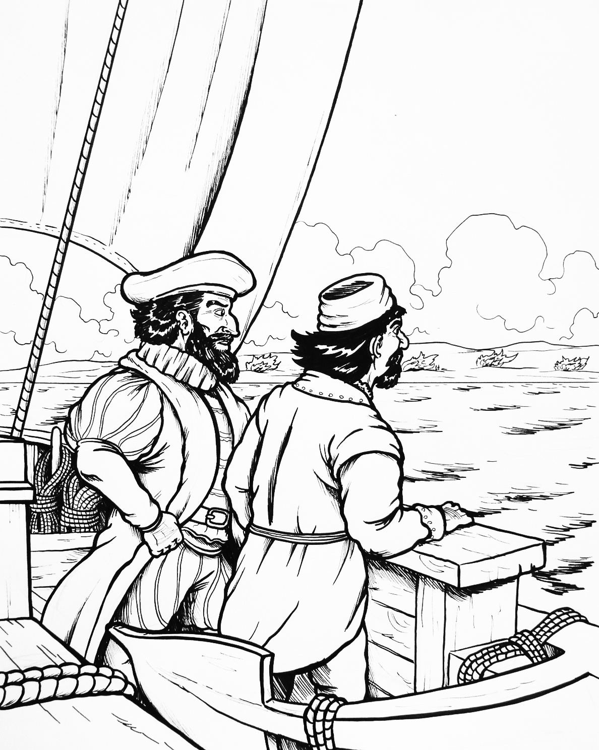 Ilustración que representa a Hernando de Magallanes en el estrecho (blanco y negro)