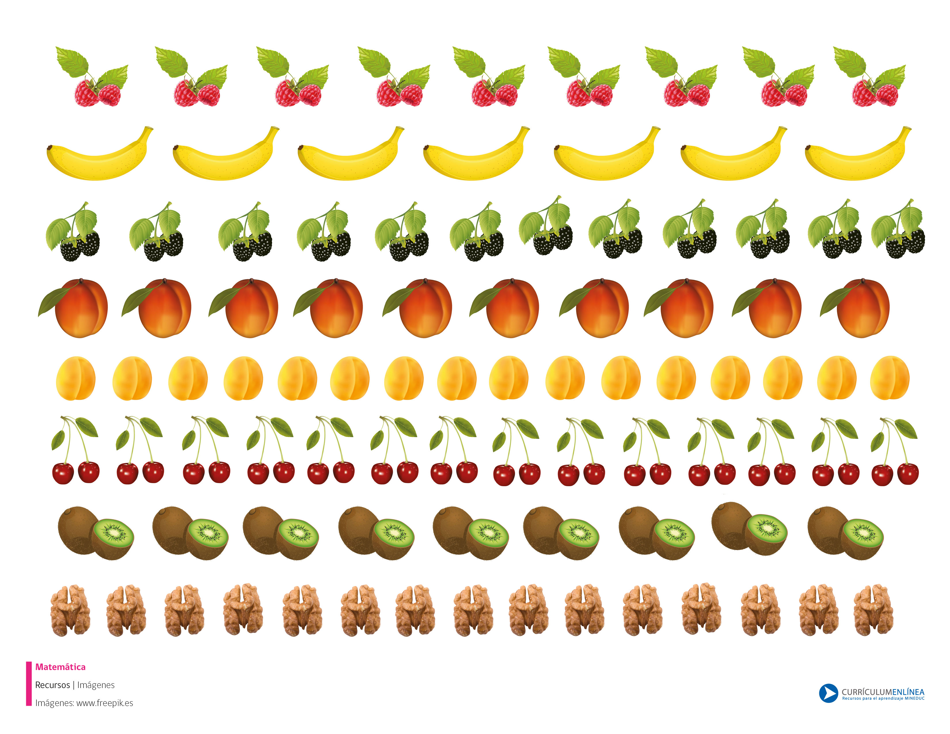 Imagen de diversas frutas para recortar que puede ser utilizada con distintos fines pedagógicos, como por ejemplo para contar, escribir la cantidad de frutas que hay en cada fila, realizar comparaciones, crear patrones y descubrir reglas de formación, etc.