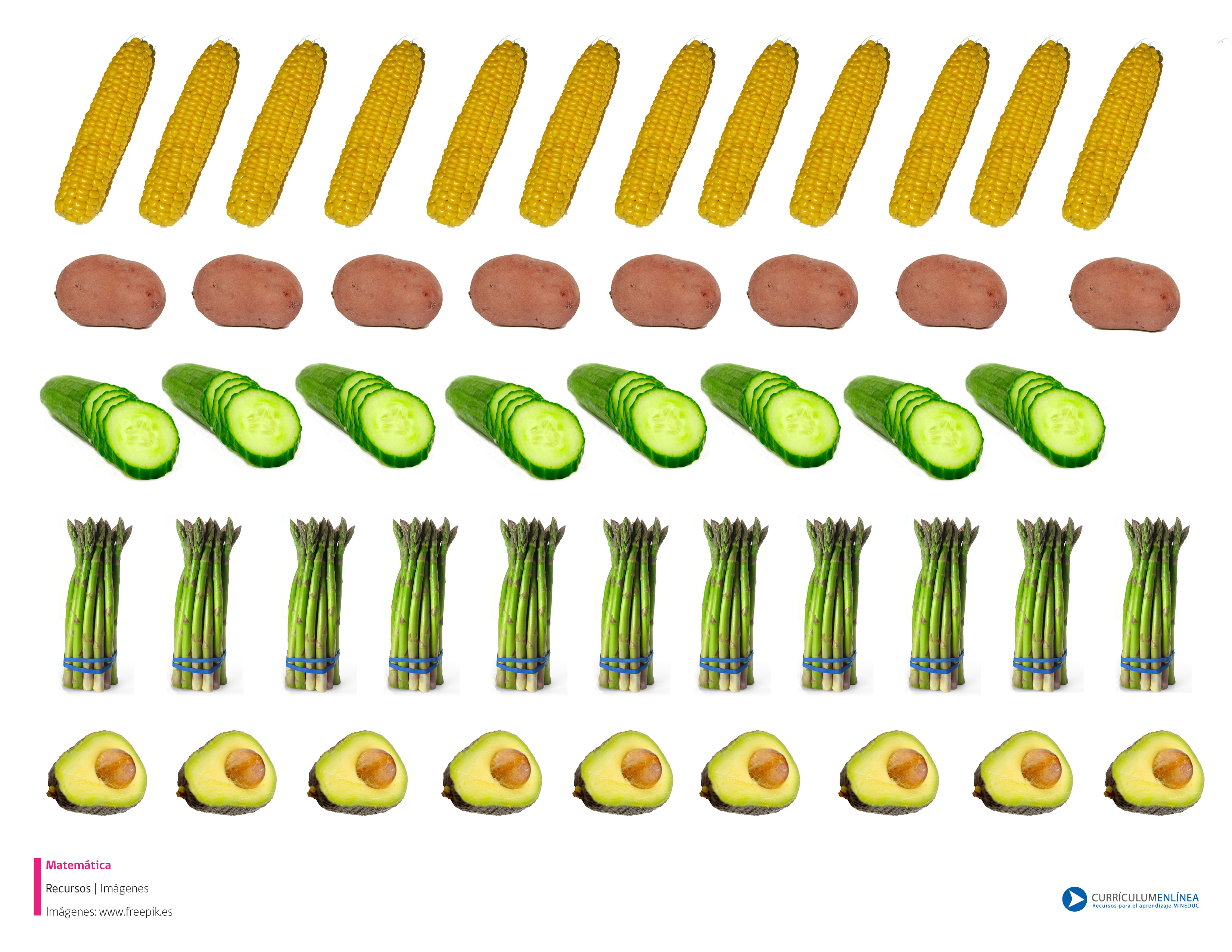 Imagen de diversas verduras para recortar que puede ser utilizada con distintos fines pedagógicos, como por ejemplo para contar, escribir la cantidad de instrumentos que hay en cada grupo, realizar comparaciones, crear patrones y descubrir reglas de formación, etc.