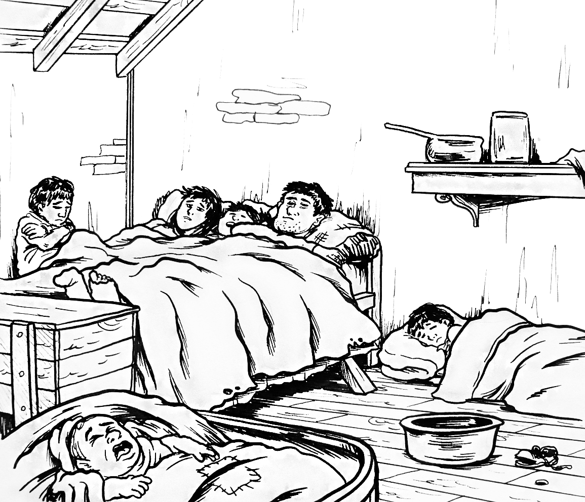 Ilustración que representa las malas condiciones de las viviendas durante la revolución industrial (blanco y negro)