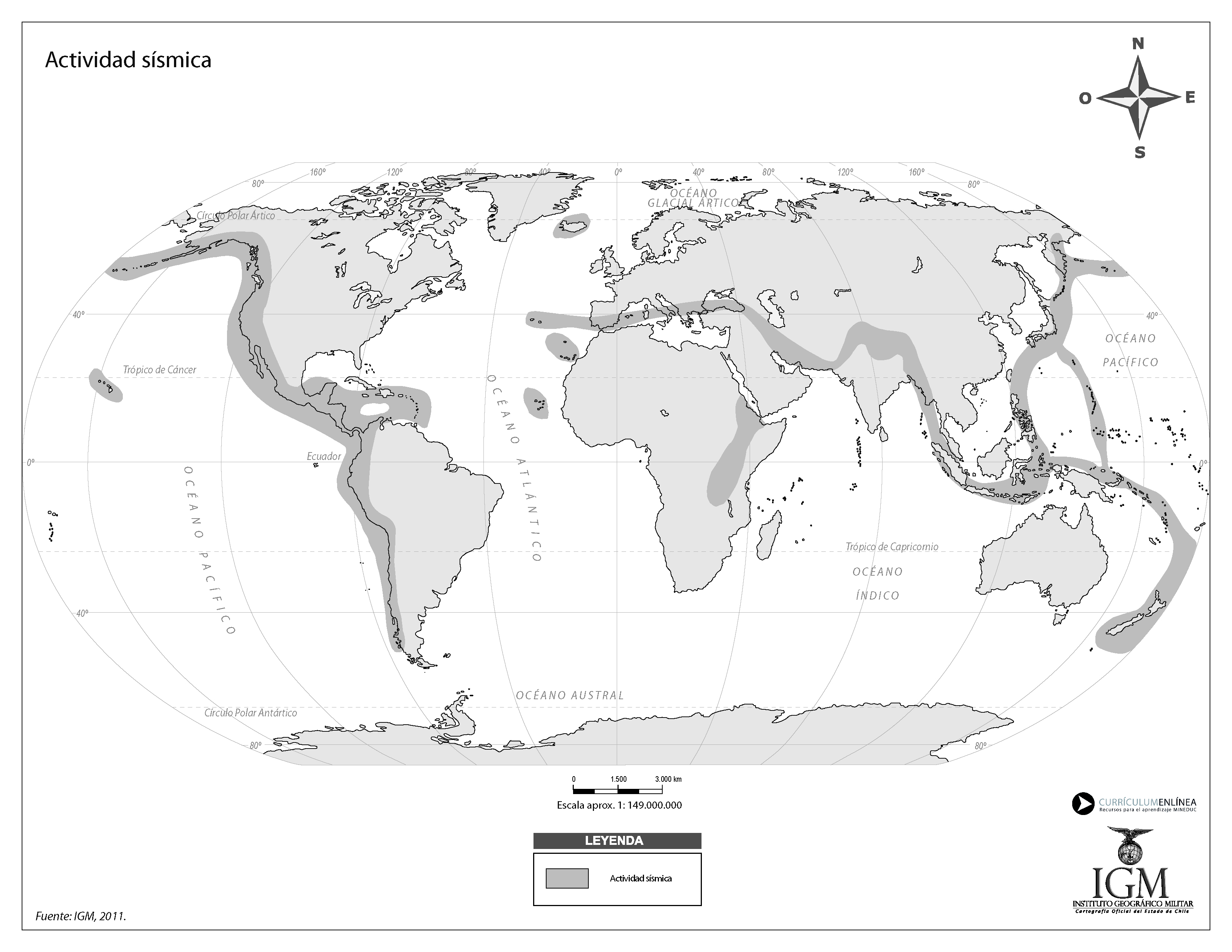 Mapa actividad sísmica del mundo en blanco y negro