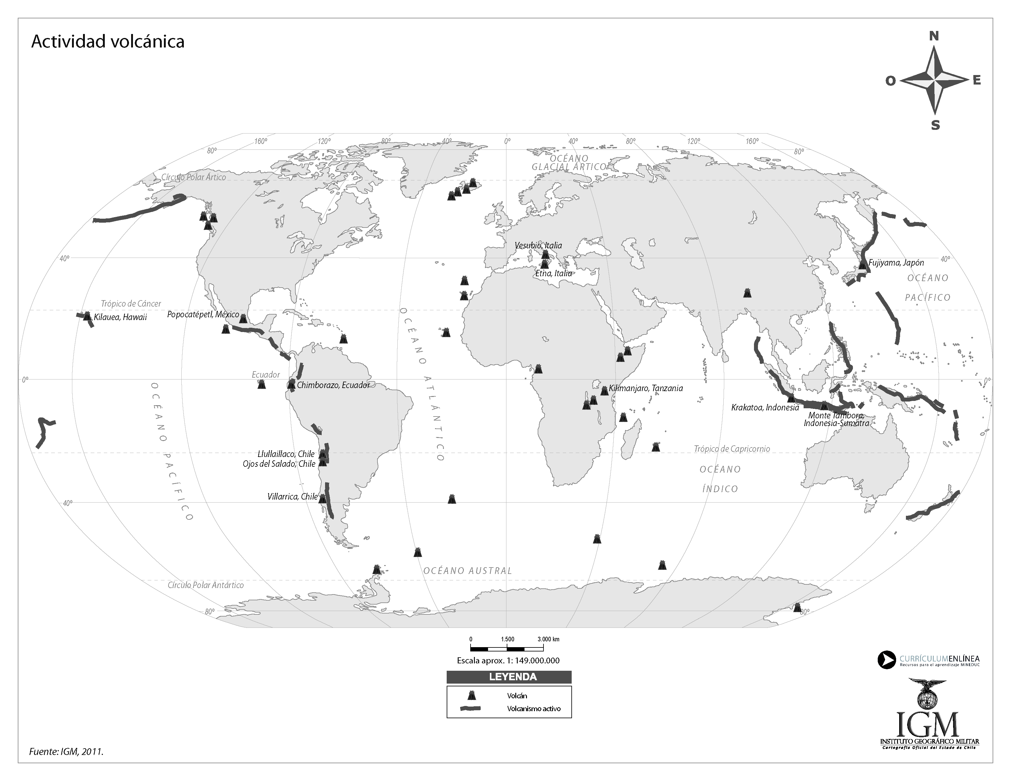 Mapa actividad volcánica en el mundo en blanco y negro