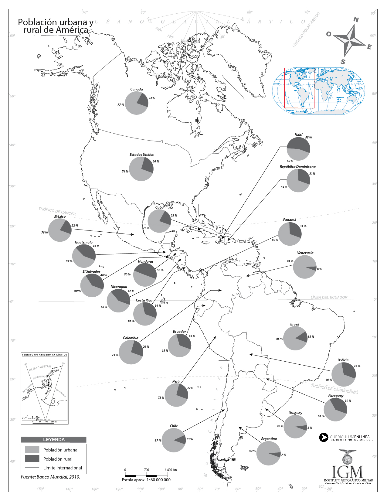 Mapa de América con sus tres zonas y las líneas imaginarias