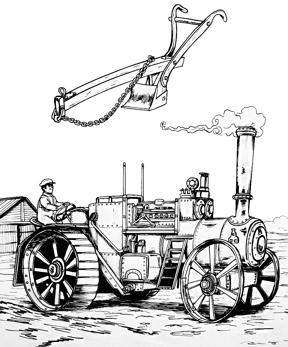 Ilustración que representa la mecanización de la agricultura durante la revolución industrial (blanco y negro)