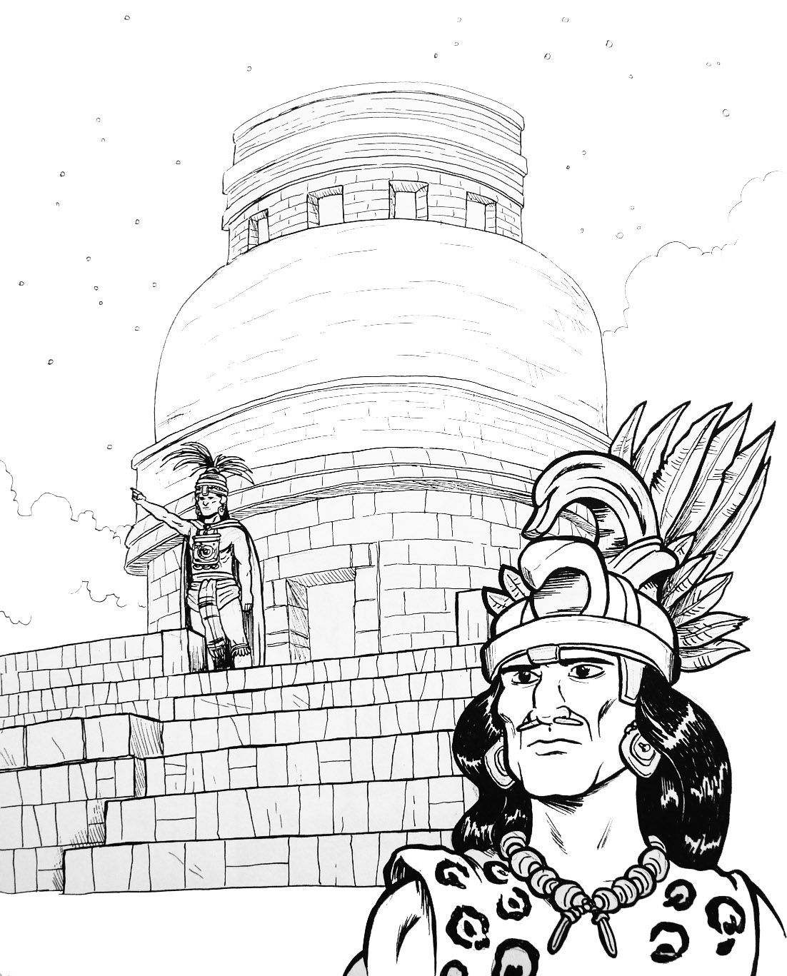 Dibujo de un observatorio astronómico maya en blanco y negro