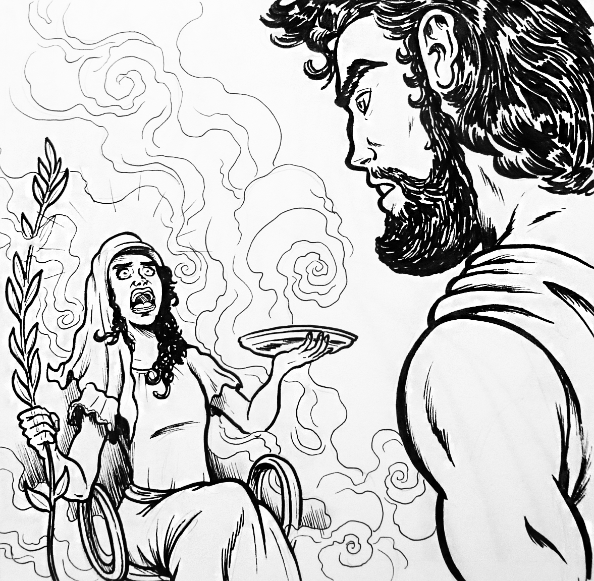 Ilustración que representa un oráculo griego (blanco y negro)