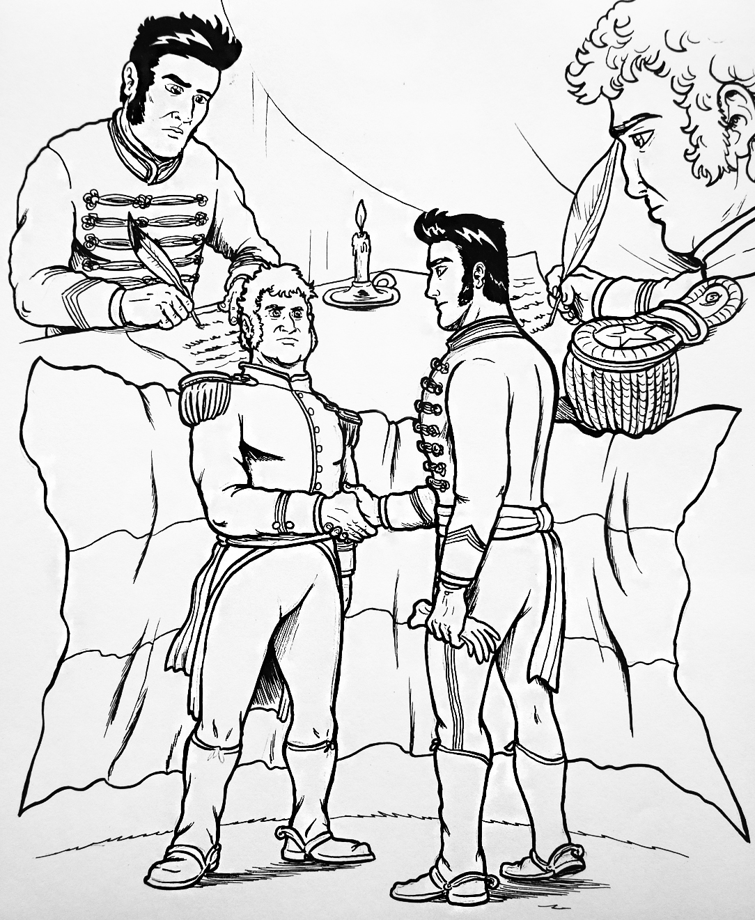 Ilustración que muestra la unidad de los líderes patriotas durante la Patria Vieja (blanco y negro)