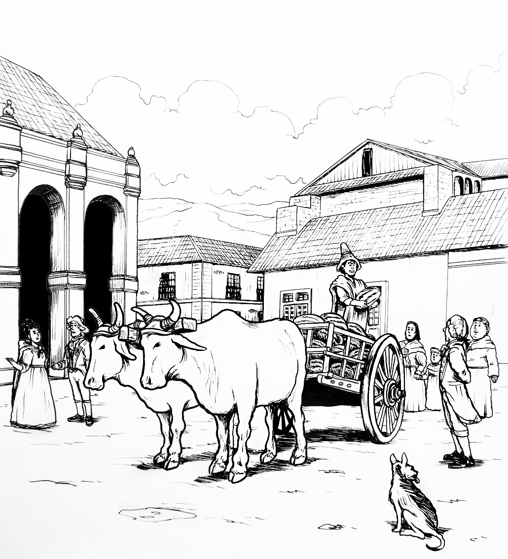 Ilustración que representa la vida cotidiana en una ciudad colonial (blanco y negro)
